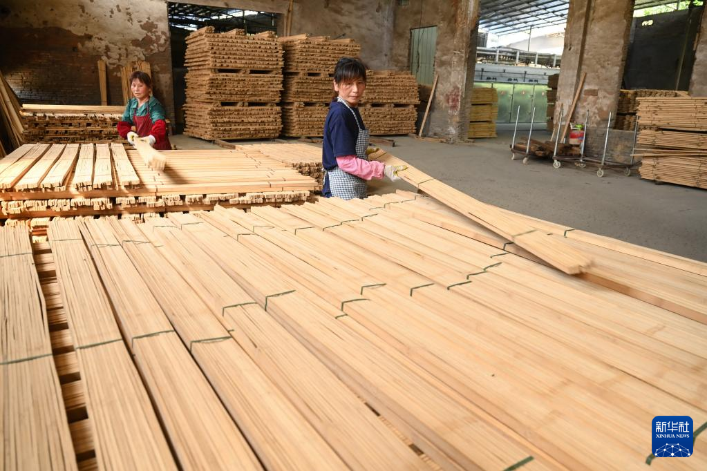 8月9日,建瓯市恒顺炭业有限公司工人在整理用来制作竹家居工艺品的竹条。
