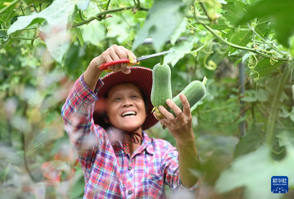 8月9日,村民在建瓯市迪口镇可建村富民农业生态观光园采摘丝瓜新品种。