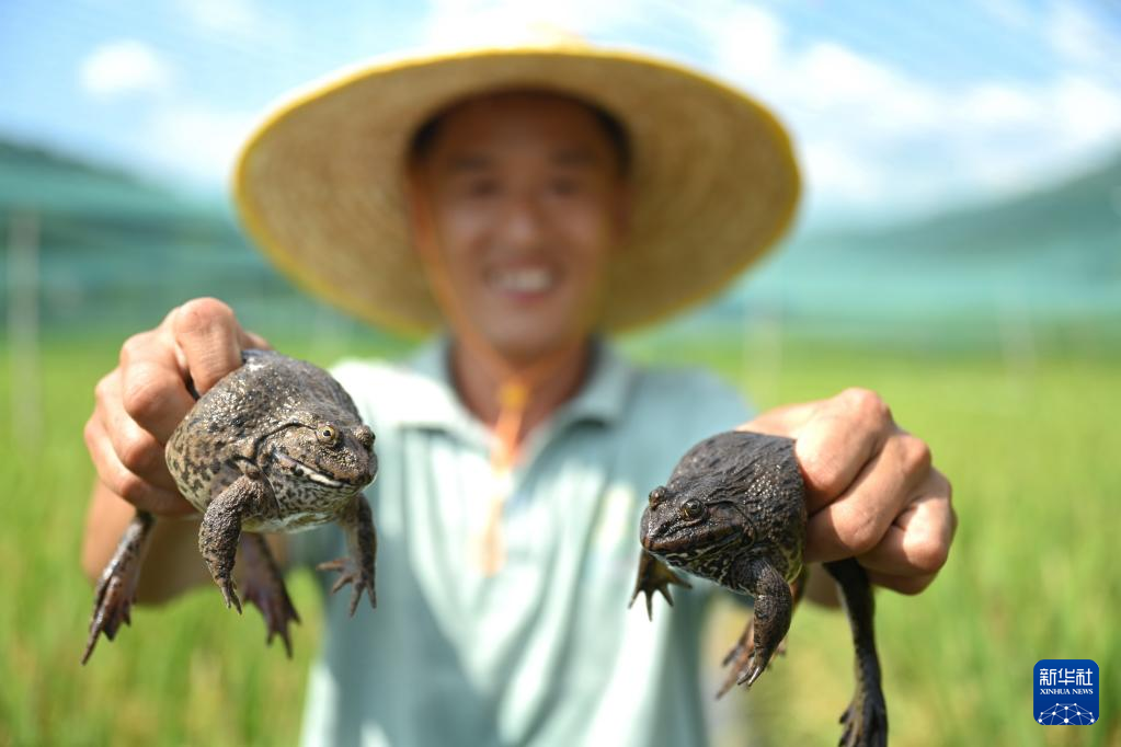 8月9日,村民在建瓯市迪口镇霞庄村稻蛙生态立体种养示范点展示生态稻田蛙。