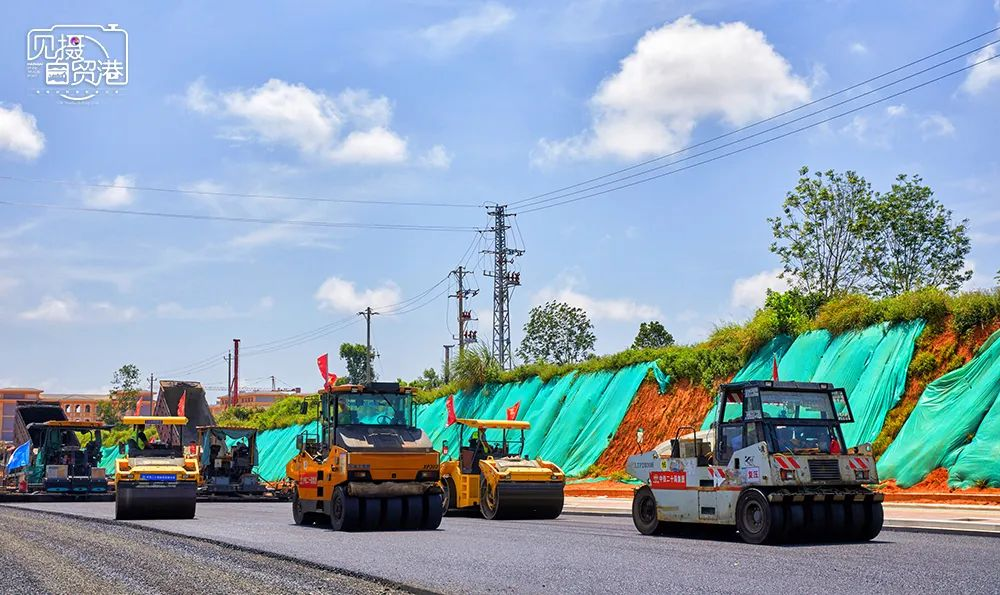 文昌国际航天城起步区“三横五纵”路网工程(一期)项目现场,施工人员进行路面沥青铺设工作。海南日报记者 封烁 摄