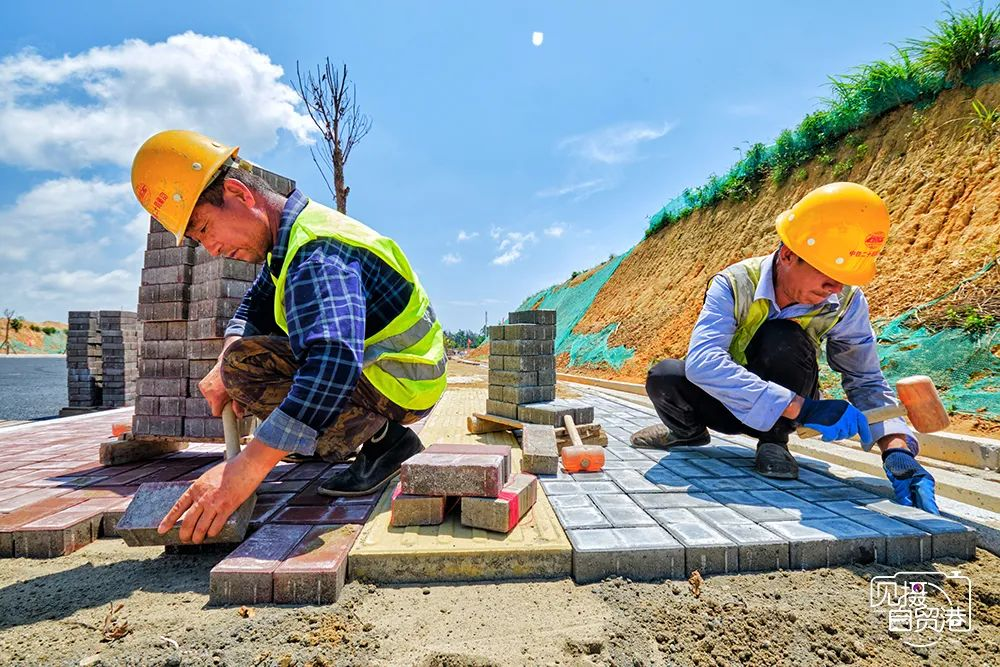 文昌国际航天城起步区“三横五纵”路网工程(一期)项目现场,施工人员进行路面砖铺设工作。海南日报记者 封烁 摄