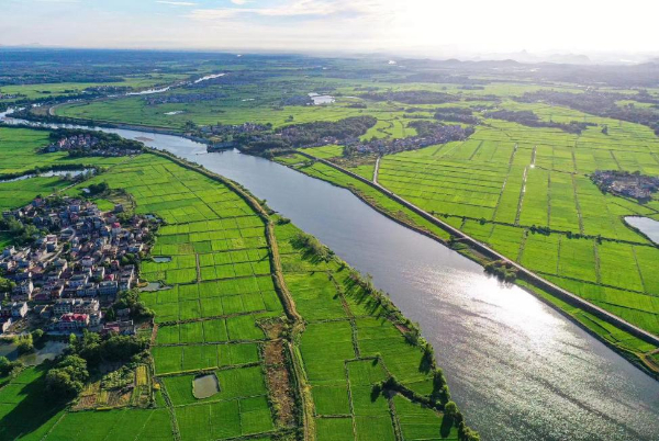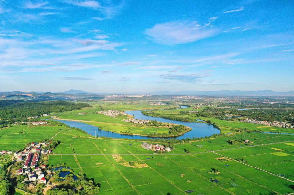 8月26日,江西省宜春市上高县新界埠镇锦江两岸的晚稻长势良好,绿油油的田园与河流、青山、村庄等相映成趣。