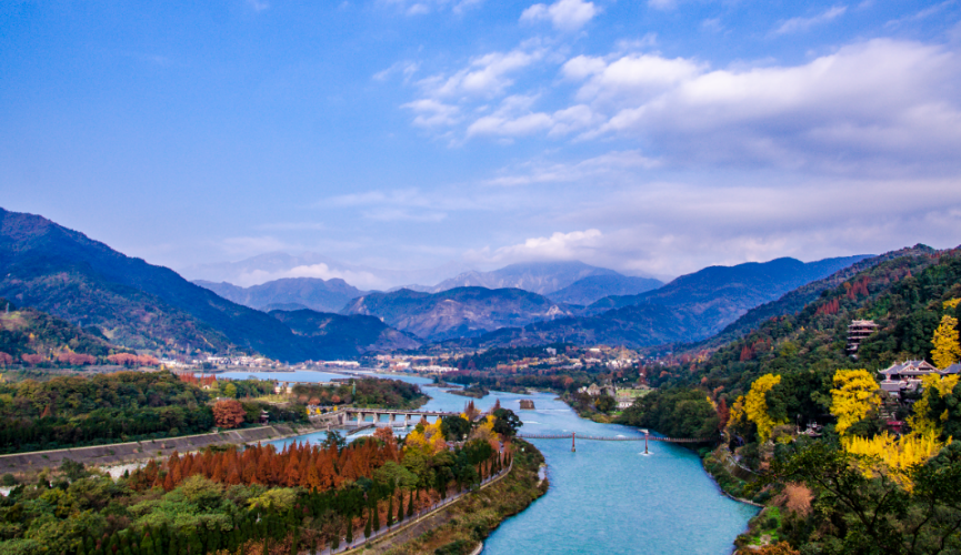 都江堰市位于成都平原西北部,距成都市中心城区38公里,辖5个镇、6个街道和2个成都市级产业功能区,幅员面积1208平方公里,是全球为数不多的集世界文化遗产、世界自然遗产、世界灌溉工程遗产为一体的“三遗之城”。拥有龙池—虹口国家级自然保护区、龙池国家森林公园、大熊猫国家公园等特色生态资源,森林覆盖率达60.34%,年均气温15.2℃,年均降水量1200毫米,空气质量多年保持成都市前列,水质达标率常年保持100%,空气负氧离子高达12000个/立方厘米,被誉为“天然氧吧”“长寿之乡”,是长江上游的重要生态屏障和成都平原的水源涵养地。