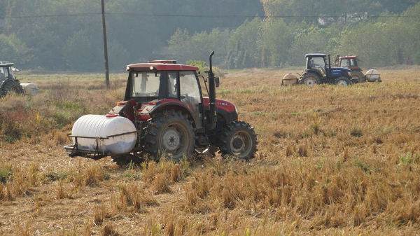 万载县白良镇白良村的绿色水稻种植基地,沼液肥施撒车正在施肥。