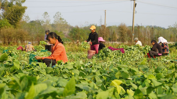 日前,万载县三兴镇花塘村毛豆基地,一串串沉甸甸的毛豆挂满枝头,村民们三三两两分布在田间忙着采摘、分拣、打包,一派忙碌景象。