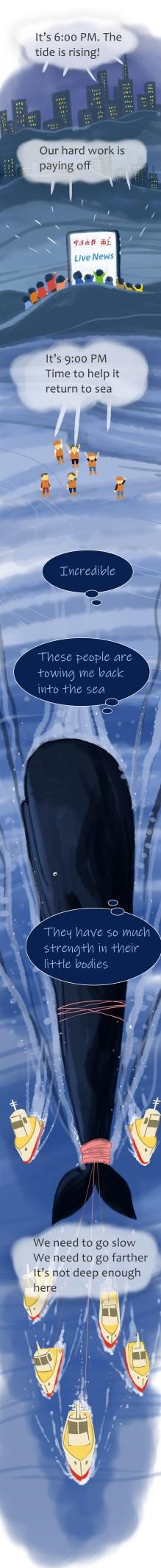 作品简介:在漫画中,鲸鱼可以说话,有了表情和心情,救援者的形象也更突出,场面也更温情有爱。在漫画中,鲸鱼和人类超越物种的界限,歌颂了爱和感恩。4月19—21日,宁波晚报推荐相关稿件和素材,在央媒和头部媒体首页推荐。