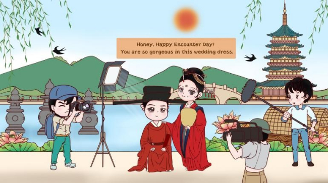 “许仙和白娘子的现代生活”漫画让杭州爱情传说中的人物穿越到现代,两人在西湖断桥上拍摄婚纱纪念照,一起担任杭州亚运会志愿者。白娘子还在长桥举行了宋韵服装秀,并参与宋韵杭州奇妙夜,为孩子们讲解宋韵服装制式,普及宋韵文化。