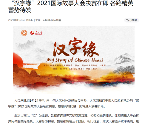 作品简介:2021年10月12日,由中国人民对外友好协会主办,西宁市人民政府、人民网承办的“汉字缘”2021国际故事大会决赛在西宁举办。