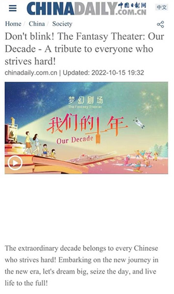 作品简介:深圳广电集团直新闻制作中英文创意短视频《梦幻剧场:我们的十年》,于10月15日发布。2分多钟短视频以书桌作为舞台,营造微型“梦幻剧场”,视频使用采用“一镜到底 逐帧手绘 CG动画 三维跟踪”等形式,仅人物手绘动画就超过400张,二次元手绘和微缩三维实景完美融合,营造出奇幻效果和梦幻氛围,通过多样的融合创新手段和个性化讲述,回望十年非凡成就。