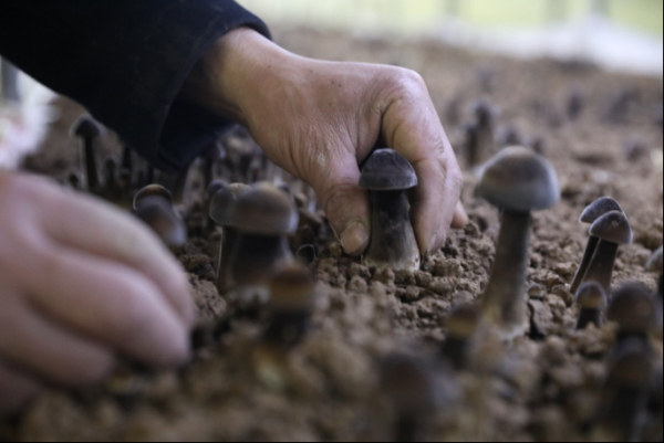 (食用菌产业园种植户梁绪明正在采摘黑皮鸡枞菌)