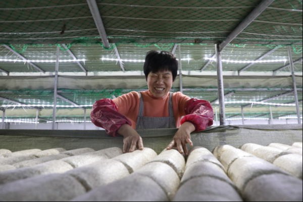 (远洋农业工作人员崔四香正在摆放黑皮鸡枞菌菌包)