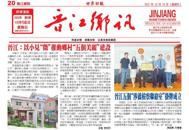 作品简介:《晋江乡讯》创办于上世纪50年代,由晋江市人民政府主管、晋江市融媒体中心主办,属于晋江市综合性正式外宣平面媒体,至今已在30多个国家和地区发行。近年来,《晋江乡讯》注重发行形式的创新,积极拓展海外发行渠道,自2022年6月16日起,与菲律宾《世界日报》合作办刊,在该报推出《晋江乡讯》“菲律宾版”,每月两期,月中、月末各一期,每期一版。此次合作办刊旨在以闽南文化为桥梁和纽带,密切海内外晋江人的情感联系,让旅居菲律宾的晋江侨亲及时了解故乡社会经济发展信息,凝聚力量,共同促进家乡发展。该刊根据菲华社会读者的特点和需求,由晋江市融媒体中心《晋江乡讯》社每月精选内容,由《世界日报》社进行编辑、出版与发行。
