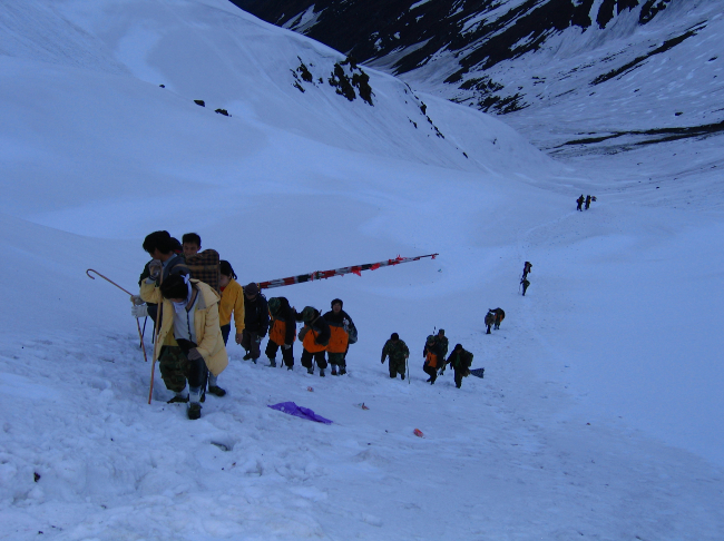 其中,2006年翻越嘎隆拉雪山的经历是所有队员最难忘的。当时海拔4500多米的嘎隆拉雪山上雪花狂舞、雪齐腰深,翻越难度非常大。上山时只能机械地沿着前面人在雪地上踩出的脚印手脚并用向上攀爬,否则就会在云遮雾锁的茫茫雪山上迷失方向。当所有队员历经6个小时成功翻越嘎隆拉雪山时,项目负责人那颗悬着的心才放下来。