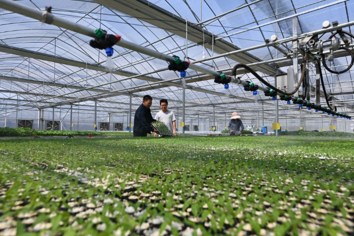 宁都县青塘镇河背村富硒千亩蔬菜产业基地,菜农在大棚内利用智能喷灌系统管理辣椒苗。