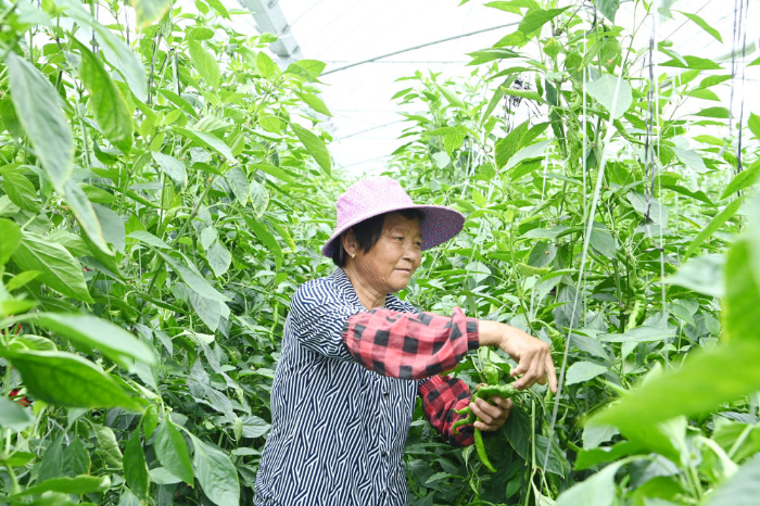 宁都县长胜镇法沙长龙高标准大棚蔬菜示范基地,菜农忙着采摘辣椒。
