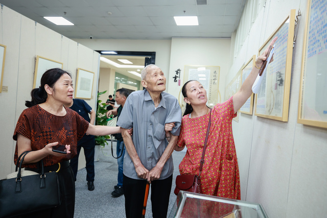 走进展厅,迎面是一张放大的湘湖师范老照片以及字迹斑驳的校牌,瞬间将时光拉回到上个世纪。现场年龄最大的校友沈云来已94岁高龄,是1949届校友、抗美援朝老兵。他与几位校友一起,站在校牌边唱起了难忘的《湘师校歌》:“波波相逐长滔滔,后波起伏前波导;人人相续长劳劳,后人生活前人教……不求相肖要相超,请看湘湖水、浙江潮!”