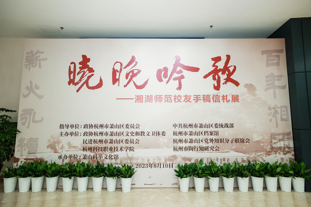 据悉,本次展览以“晓晚吟歌”为题,是由于展览内容主要聚焦于担任了25年湘师校长的金海观。金校长字晓晚,当年被师生亲切地称呼为“金师”或“晚师”。此次展出的手稿信札主要来自湘师1988届虞万钧等湘师校友、金海观长子金陵、《金海观传》作者蒋明炬和区知联会、杭州科技职业技术学院等的捐赠。开幕式上为捐赠者代表颁发了捐赠证书,举行了《晓晚吟歌——湘湖师范校友手稿选》赠书仪式。