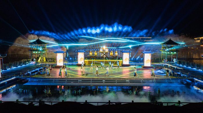 据悉,七鲤古镇度假区是在原古建基础上,融合当地文化为体验场景,结合街区多种复合业态,打造了全景区沉浸式万人剧本游,推出了夜宴、夜秀、夜游、夜娱四大主题产品,实现了吃、住、行、游、购、娱等全方面融合发展,致力于打造面向赣粤闽湘的文化型古镇目的地。
