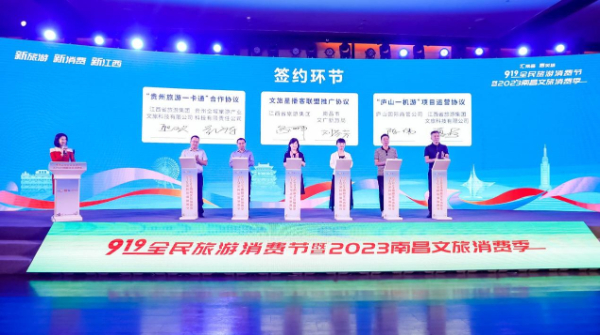 开幕式上,江西省旅游集团与北京银行南昌分行、新疆文化旅游投资集团、统一标识代码注册管理中心(河南)有限公司、桂林旅游学院等签订战略合作协议;南昌市文广新旅局和江西文旅星播客联盟签署推广合作协议;江西省旅游集团文旅科技有限公司与贵州全域旅游产业科技有限公司、庐山国际商管公司就“一码游”“一机游”项目签约。