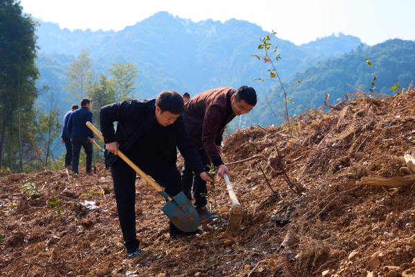 3月9日,江西省上栗县桐木镇组织镇村干部、护林员开展植树活动。植树现场,大家拿着铁锹、铲子等工具,挥锹掘土、扶树正苗、回填踩实,干劲十足,配合默契,一片繁忙景象。 钟亮摄
