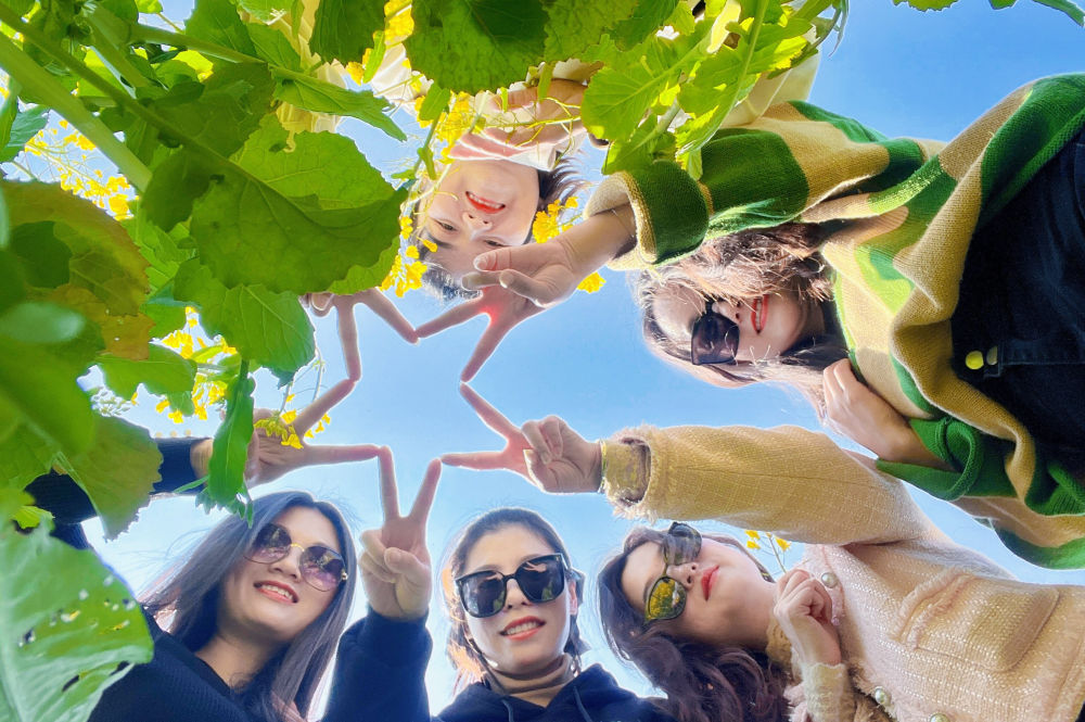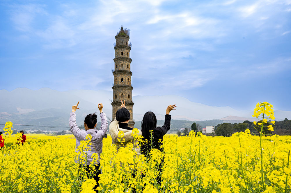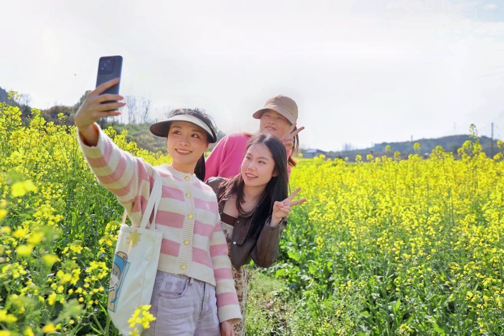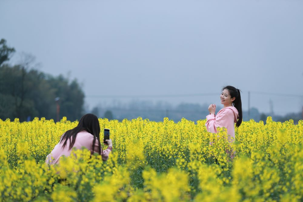 近日,游客在江西萍乡市南坑镇山田村油菜种植基地赏花游玩。何慧君 摄