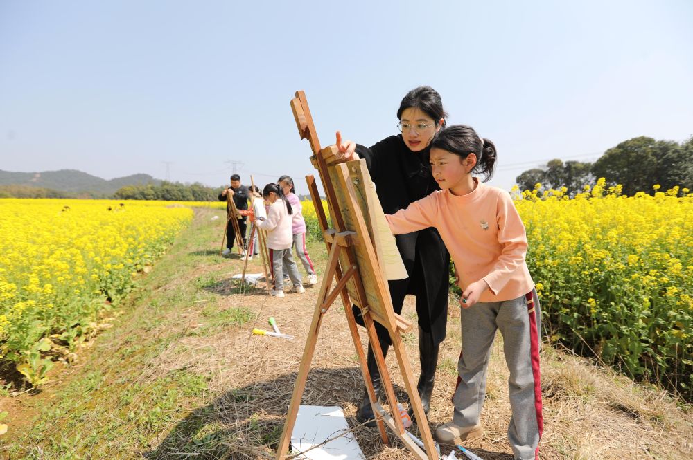 近日,江西抚州市东乡区詹圩镇詹圩小学的师生们走进大自然,在花田里游玩打卡,用画板描绘春天。饶方其 摄