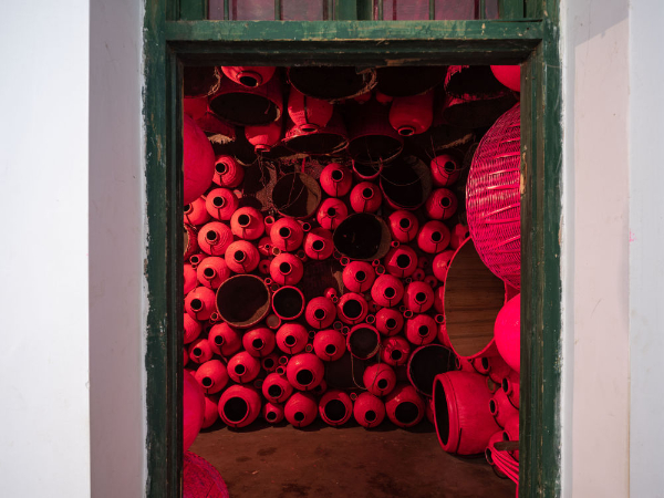 在名为《记忆的容器》的作品前,游客被房间里涂成粉色的各种容器吸引。“这些挨家挨户收集来的旧东西,有些是当初从浙江带来的。你看猪草筐、酱菜瓮、旧水缸的口都对着我们,像不像在湖底的状态?那些容器口像不像一张张嘴,默默讲述每户人家的故事?”钱长仙娓娓道来。