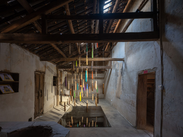 陶艾民收集洗衣棒槌,涂上颜色,倒挂屋中,就像从天而降的雨滴,落入下方由玻璃拼成的“方井”内。“洗衣棒槌是当地女孩出嫁时必不可少的陪嫁品。结婚以后几乎每天都要洗衣服,洗衣棒槌上写的是女人一生。”