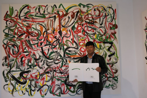 寒溪村村支书谢恩安在艺术作品《五百笔@浮梁》前,展示自己的一笔。他画的那笔意为绿水青山。新华每日电讯记者张典标摄