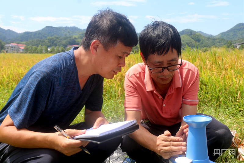 农技人员在田间实割测产(央广网发 李锡 摄)