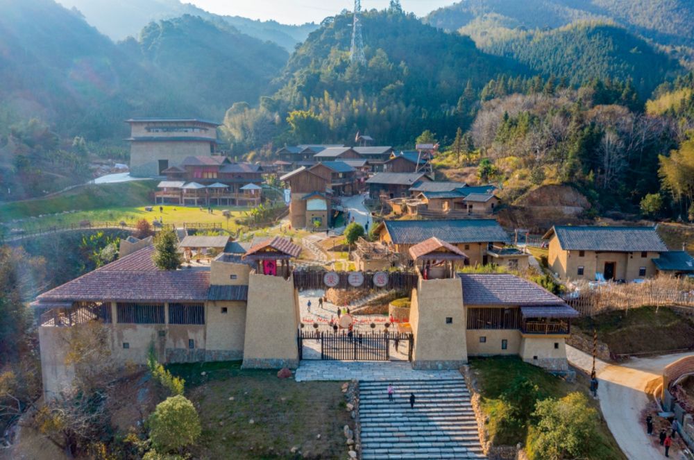 黄色是左溪村阳明寨景区建筑墙面的主色调,古朴的赣南传统民居背靠青山绿水,别有一番宁静的诗意。这里距离县城中心仅7.6公里,曾经的省级“十三五”贫困村如今已被打造成一个桃花源式的村落,部落民居、乡间民宿以及丰富多彩的游乐业态一起,组成了一个乡村旅游目的地。