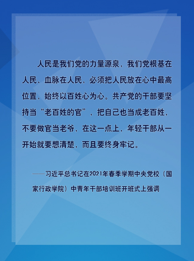 近日,2021年春季学期中央党校(国家行政学院)中青年干部培训班在中央党校开班。习近平总书记在开班式上强调,共产党的干部要坚持当“老百姓的官”,把自己也当成老百姓,不要做官当老爷,在这一点上,年轻干部从一开始就要想清楚,而且要终身牢记。这一席意味深长的话,为广大党员干部特别是年轻干部坚持人民至上、当好人民公仆指明方向、寄予厚望。