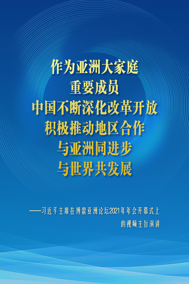 20日,博鳌亚洲论坛2021年年会开幕式在海南博鳌举行,习近平主席以视频方式发表题为《同舟共济克时艰,命运与共创未来》的主旨演讲,倡议亚洲和世界各国要回应时代呼唤,携手共克疫情,加强全球治理,朝着构建人类命运共同体方向不断迈进。