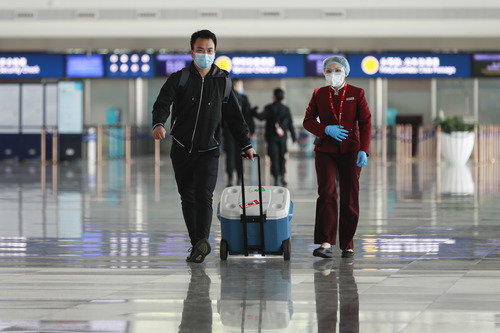 2020年4月24日,武汉协和医院心外科医生卢雄豪(左)运送来自山东的供肺抵达武汉天河机场。疫情期间该航班取消,移植团队与中国国际航空公司取得联系告知这一情况后,该公司紧急启动绿色通道,重新开通此航班。新华社记者 沈伯韩 摄