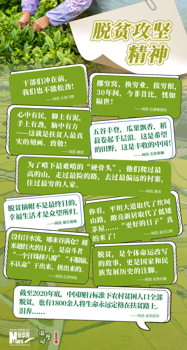 加油干,更好的日子还在后头!摘掉贫困帽子的千年夙愿已成真,中华大地正焕发出勃勃生机。正如网民们所说,“脱贫摘帽不是最终目的,幸福生活才是众望所归。”站在新的历史起点上,在伟大精神的指引下,中国共产党必将带领各族儿女勇往直前,不断续写新的胜利。(文字:徐可 海报设计:王晔)