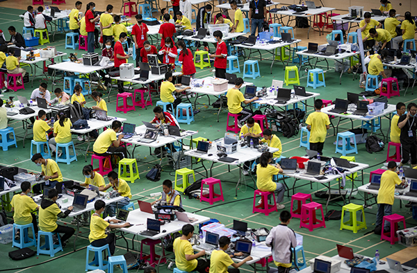 5月29日,第35届云南省青少年科技创新大赛举行。图为参赛学生在比赛待赛区调试机器人。