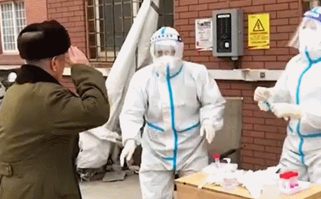 在山东淄博,91岁老人毕凤德,本可以接受上门核酸检测服务,但他依然拄拐下楼排队做检测,并向工作人员敬礼,“你们这么辛苦,是为了大家的健康。”