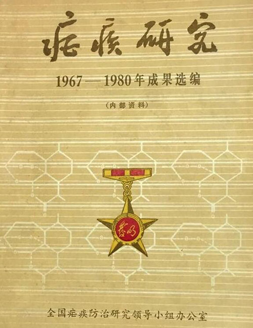 这本《疟疾研究:1967—1980年成果选编》的封面上,印有一枚闪亮的勋章,勋章下的底图是白描的分子结构。