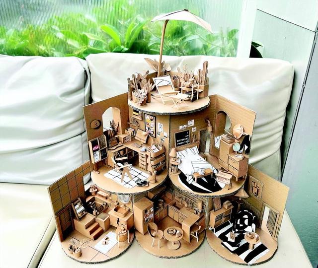 对,快递盒。广西桂林的一位妈妈陪儿子完成科学作业后,意外喜欢上手工。她用废弃的快递盒、碎布头建造出了一个个小房子,有儿童屋、小厨房、小浴室、小阳台,还有街头移动咖啡车……真是细节满满。