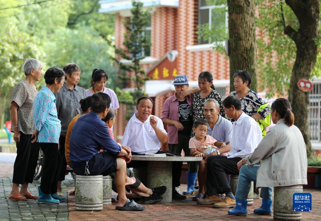 江西芦溪县宣风镇珠亭村人民调解员阳昌绍(中)为珠亭村的百姓宣讲民法典知识(2021年8月17日摄)。新华社记者 胡晨欢 摄