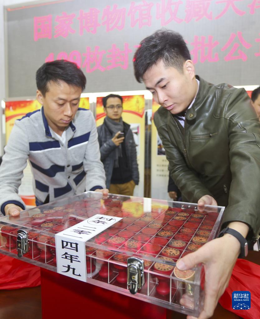 2014年11月15日,国家博物馆工作人员搬走天津滨海新区109枚封存审批公章。新华社发(付文超 摄)
