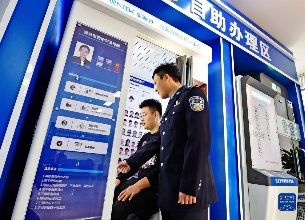 在辽宁省本溪市公安局北地派出所民警指导下,市民通过自助体检机完成机动车驾驶人检测项目(2021年12月10日摄)。新华社发
