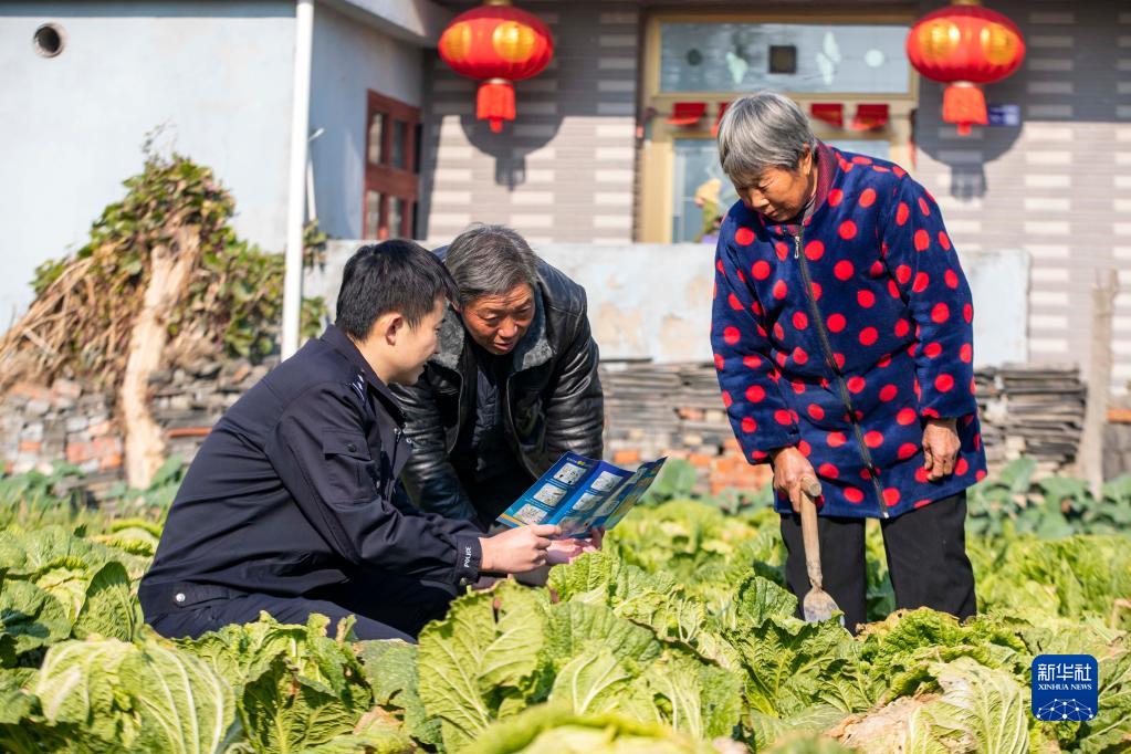 江苏省泰州市海陵区苏陈派出所民警在苏陈社区田间地头向农户进行普法宣传(2021年12月4日摄)。新华社发(汤德宏 摄)
