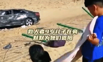 9岁的儿子也主动拿出毯子为伤者遮阳