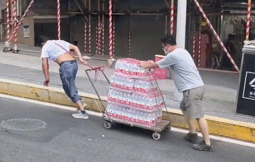 高温天气下一男子正奋力拉货上坡