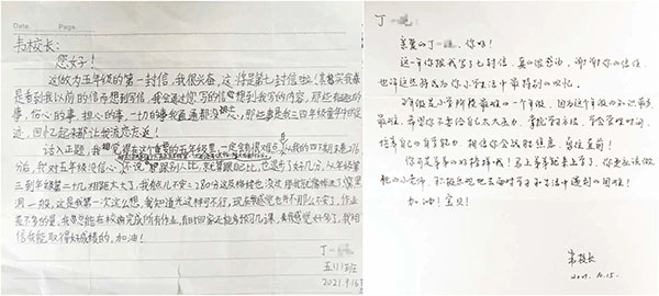 看到报道后,二胎爸爸丁志刚才知道,女儿从四年级开始就与校长通信,自己和家人由于勤于照顾弟弟,忽视了女儿的情绪。“我也试着用书信的方式与她说说话,平等交流,像韦校长那样与孩子建立信任。”