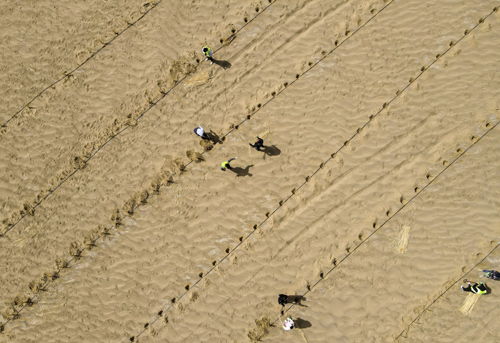 茫茫沙海上,人显得十分渺小。但沙漠上的“绿色”,就是这些人创造出来的;沙漠里长长的铁路,也是这些人建造出来的。