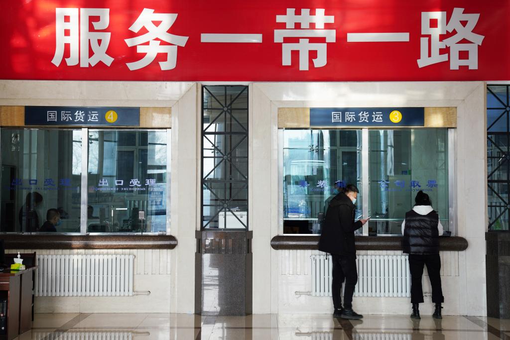 在绥芬河站国际联运交易所大厅,货代公司业务员在办理业务(2021年3月31日摄)。新华社记者王建威摄