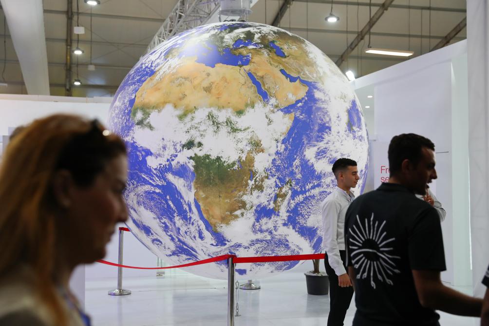 2022年11月10日,在埃及沙姆沙伊赫的联合国气候变化大会展区内,参会者走过一个地球模型。新华社记者隋先凯摄