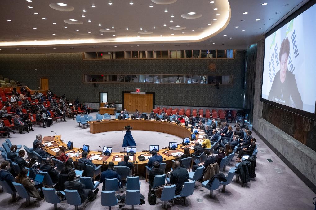 这是2023年11月20日在位于纽约的联合国总部拍摄的安理会“共同发展促进持久和平”公开辩论会现场。中国作为轮值主席,倡议联合国安理会20日举行主题为“共同发展促进持久和平”的公开辩论会。新华社发(联合国供图/埃斯金德·德贝卜摄)
